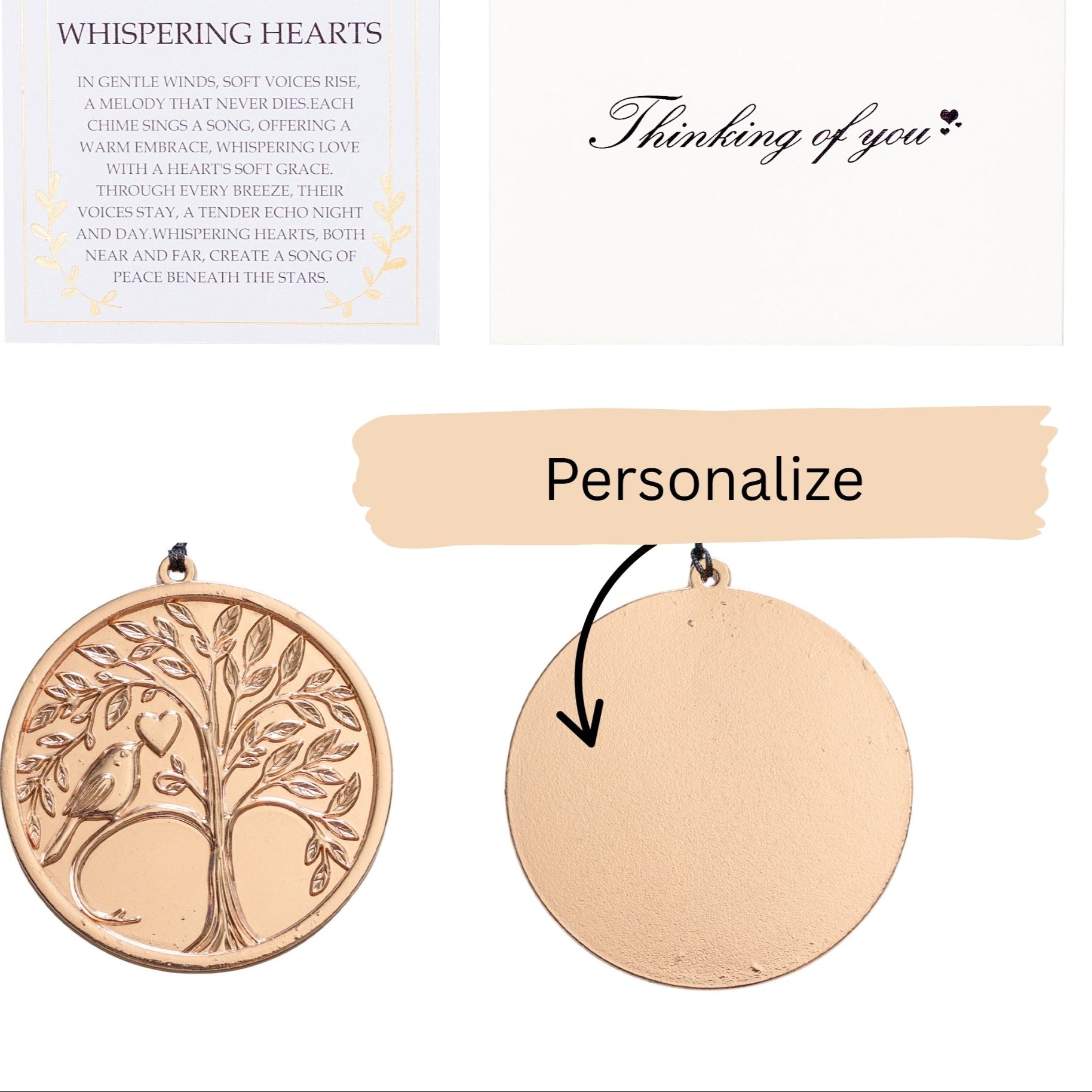 Provide a more meaningful gift with a personalized wind chime. The poems on the front of each sail stay, as shown on product listing. The personalization will replace the tree side of the sail pendant. We can use this side to create whatever you'd like in order to provide a touching gift cherishing those speical memories. Most customers still choose to use our signature tree, then personalize underneath it. Whichever the case, provide us details of your personalization by selecting the personalization option on the product page. If there is no option for personalization on product page, it’s not offered on that product currently but check back soon!