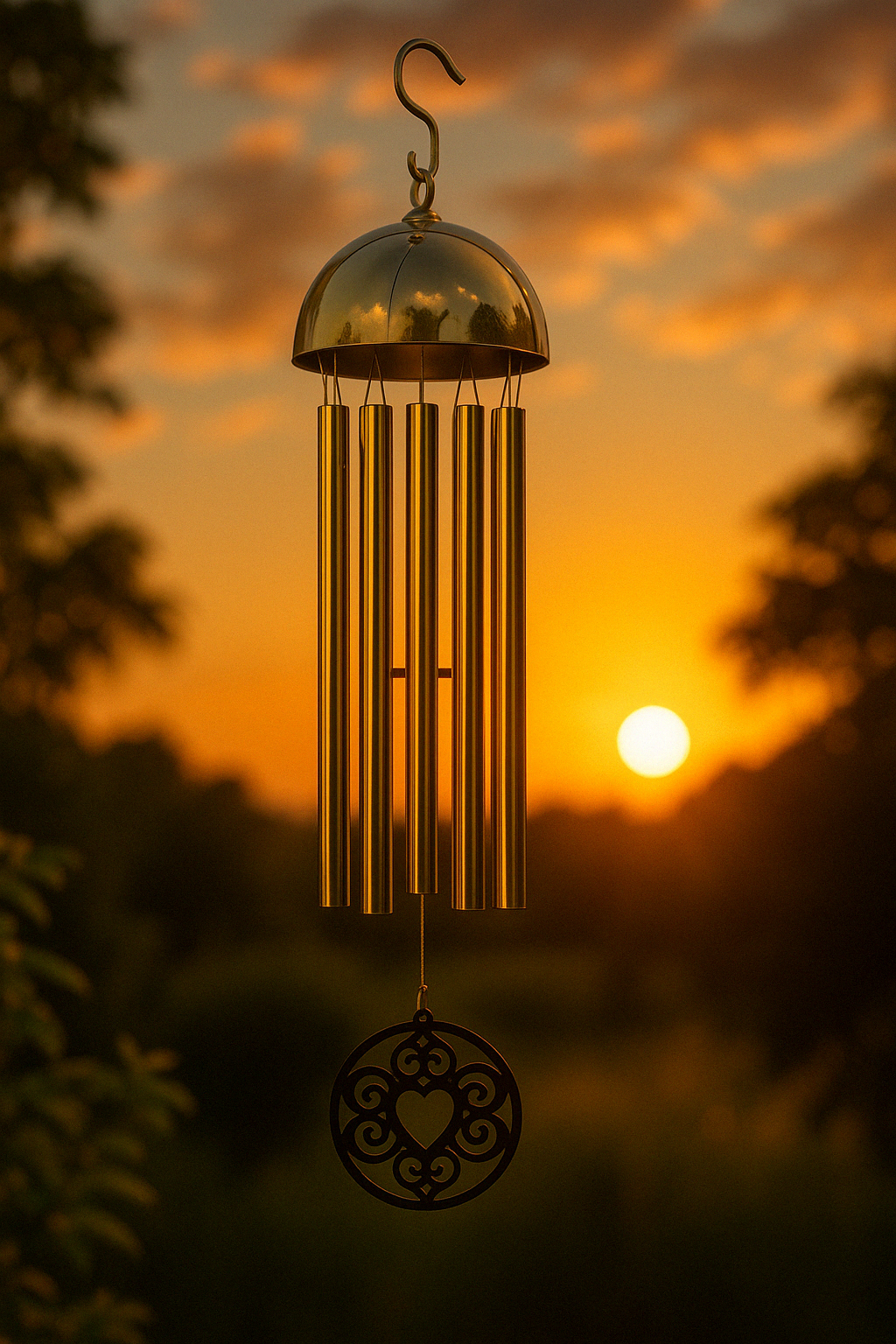 This elegant 15-inch wind chime from our Whispering Hearts™ Collection offers a timeless way to honor a loved one. Crafted from anodized aluminum with a warm gold finish, its soft, melodic tones bring peace and remembrance to any space. The unique dome top and delicate heart-themed sail create a graceful silhouette—perfect for indoor display or outdoor serenity.